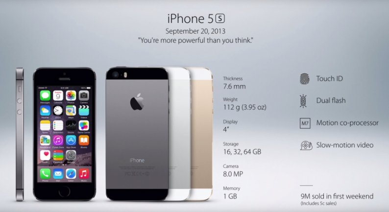 Between the iPhone 5S and the iPhone 5C, Apple sold nine million units in the first week of sales. The iPhone 5C was meant to be slightly more affordable and had a plastic shell. It was available in four different colors, but not too much else was different. The iPhone 5S, on the other hand, introduced Touch ID, dual flash, and slow-motion video. Plus it included the M7 motion co-processor, which opened a new realm of possibilities and also helped save battery life.